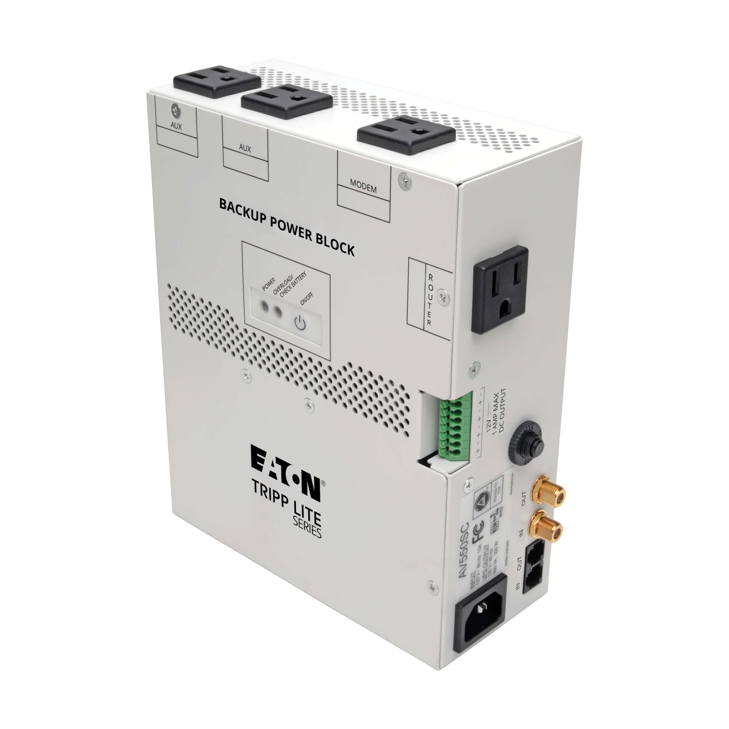 The AV550SC Backup Power Block provides the highest level of protection for structured cabling installations (ie. telephone, Internet and coax connections). With reliable battery backup, surge protection and EMI/RFI line noise filtering, the AV550SC provides a complete protection solution for audio/video distribution systems by supporting modems, routers, RF amplifiers, network interfaces, cameras, modulators and other equipment through all power problems. In the event of a power failure, the AV550SC includes an auto-restart feature that eliminates the need to perform an on-site restart. In addition, when a modem or router freeze-up occurs, the AV550SC features a recycle/reset button with sequential outlet startup for proper modem and router rebooting.
