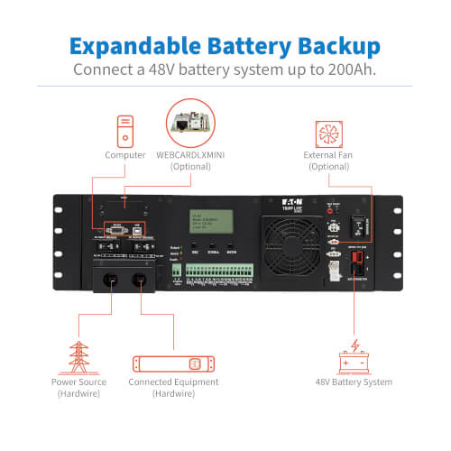 Backup support allows you to safely maintain the operation of critical traffic/industrial equipment and other applications requiring reliable extended UPS runtime in demanding environments. A battery connector kit with wireable contact pins lets you connect your own 48V battery banks up to 200Ah (batteries and cables not included). A temperature sensor monitors the battery terminals and customizes charging to optimum levels to extend the lifespan of the connected batteries.