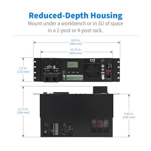 Hardware is included for mounting the SMART1548ET in 3U of space in an EIA-standard 19-inch 2-post or 4-post rack or on a flat desktop surface. The reduced-depth housing requires less than 10 inches of equipment rack depth for convenient two-point installation.