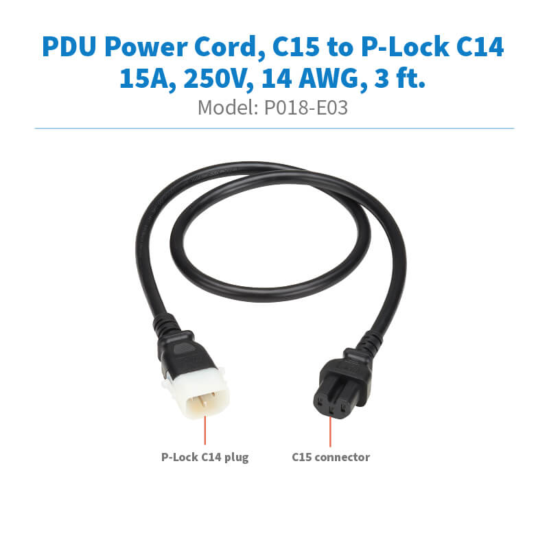 P018-E03 PDU Power Cord, C15 to P-Lock C14, 3 ft. (0.9 m), Black