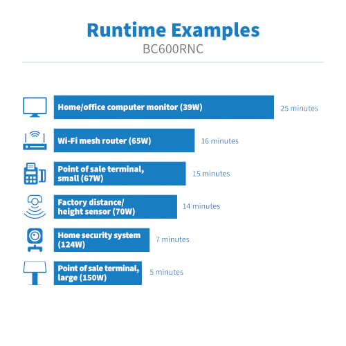 The BC600RNC restarts automatically once power is restored, regardless of battery charge level, saving you a costly site visit. During short blackouts and brownouts, the BC600RNC switches to battery power to keep connected equipment running. This allows you enough time to save data and complete a safe shutdown in case of a longer outage.