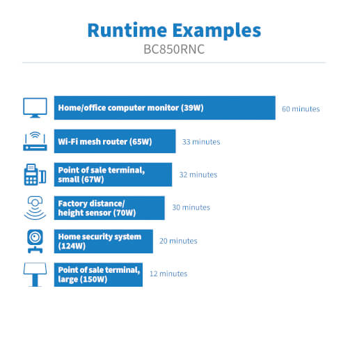 The BC850RNC restarts automatically once power is restored, regardless of battery charge level, saving you a costly site visit. During short blackouts and brownouts, the BC850RNC switches to battery power to keep connected equipment running. This allows you enough time to save data and complete a safe shutdown in case of a longer outage.