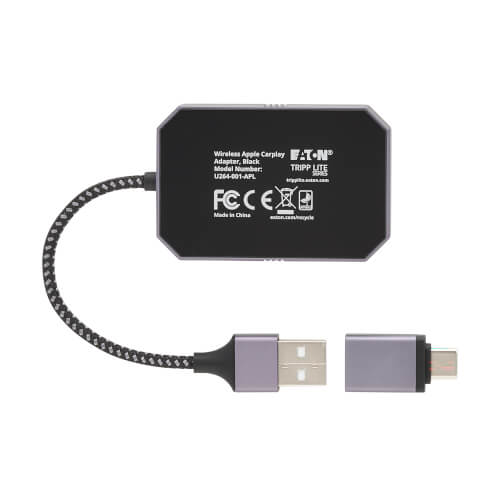 The U264-001-APL adapter provides a wireless connection to Apple CarPlay in vehicles that require a wired CarPlay connection. It is compatible with Apple iPhone 6 or later models that are on iOS 10 and above. Not only does this adapter reduce cable clutter in your vehicle, it also allows you to operate CarPlay functions such as music and podcast control, answer calls and texts via voice-to-text, navigate via Apple Maps and make voice commands through Siri. An included USB-A to USB-C adapter lets you connect to either port in a vehicle.
