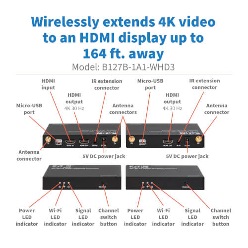Extends a wireless 4K HDMI audio/video signal with low latency to an HDMI display located up to 164 ft. from the source device.