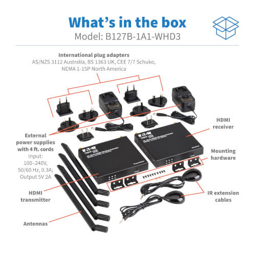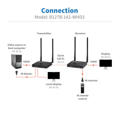 The B127B-1A1-WHD3 eliminates more than just hassles. You’ll save on the costs of cabling infrastructure and the labor to install it in areas where running HDMI cabling through walls is costly or not possible. Cable clutter is reduced, and you will enjoy more flexibility in placement of the source and display with no cables to relocate when you want to reconfigure the room.